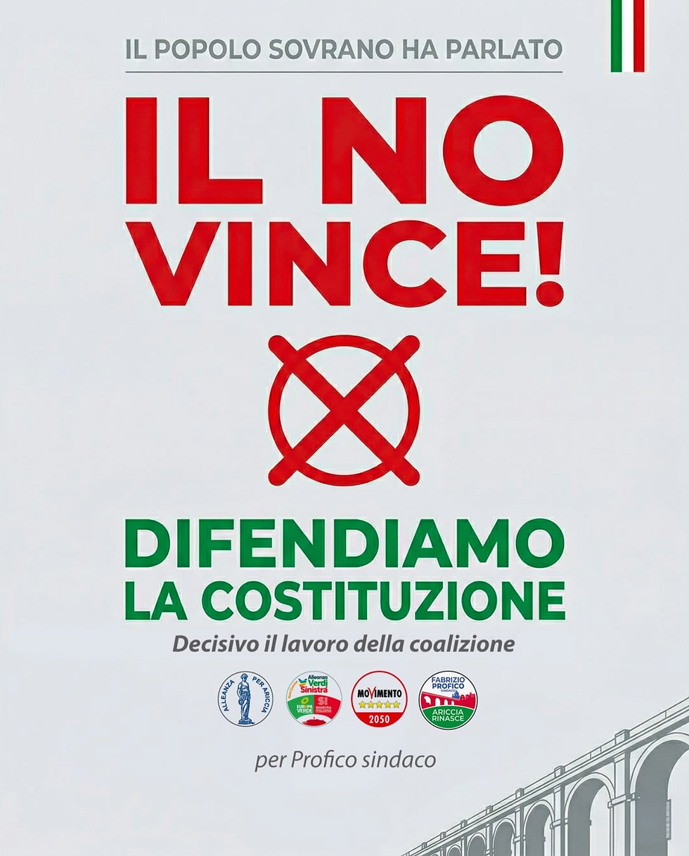 Il giudizio espresso è netto anche sul piano valoriale. “Abbiamo difeso i nostri diritti, la nostra autonomia e la nostra identità. La vittoria del No è un successo per tutta la comunità di Ariccia”, aggiunge.